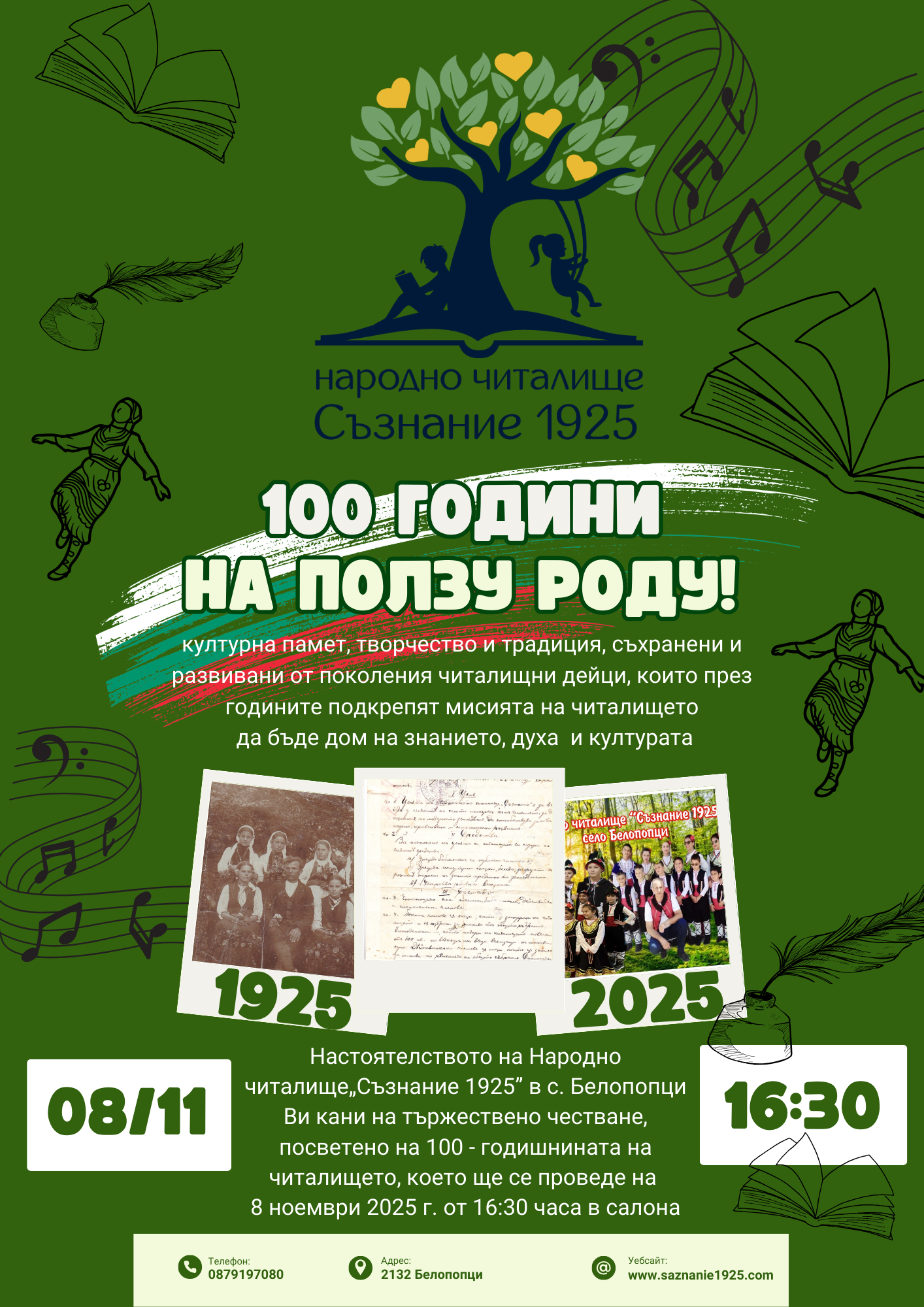 Да споделим заедно радостта, вдъхновението и духа на читалището, което вече 100 години е дом на знанието, културата и общността.